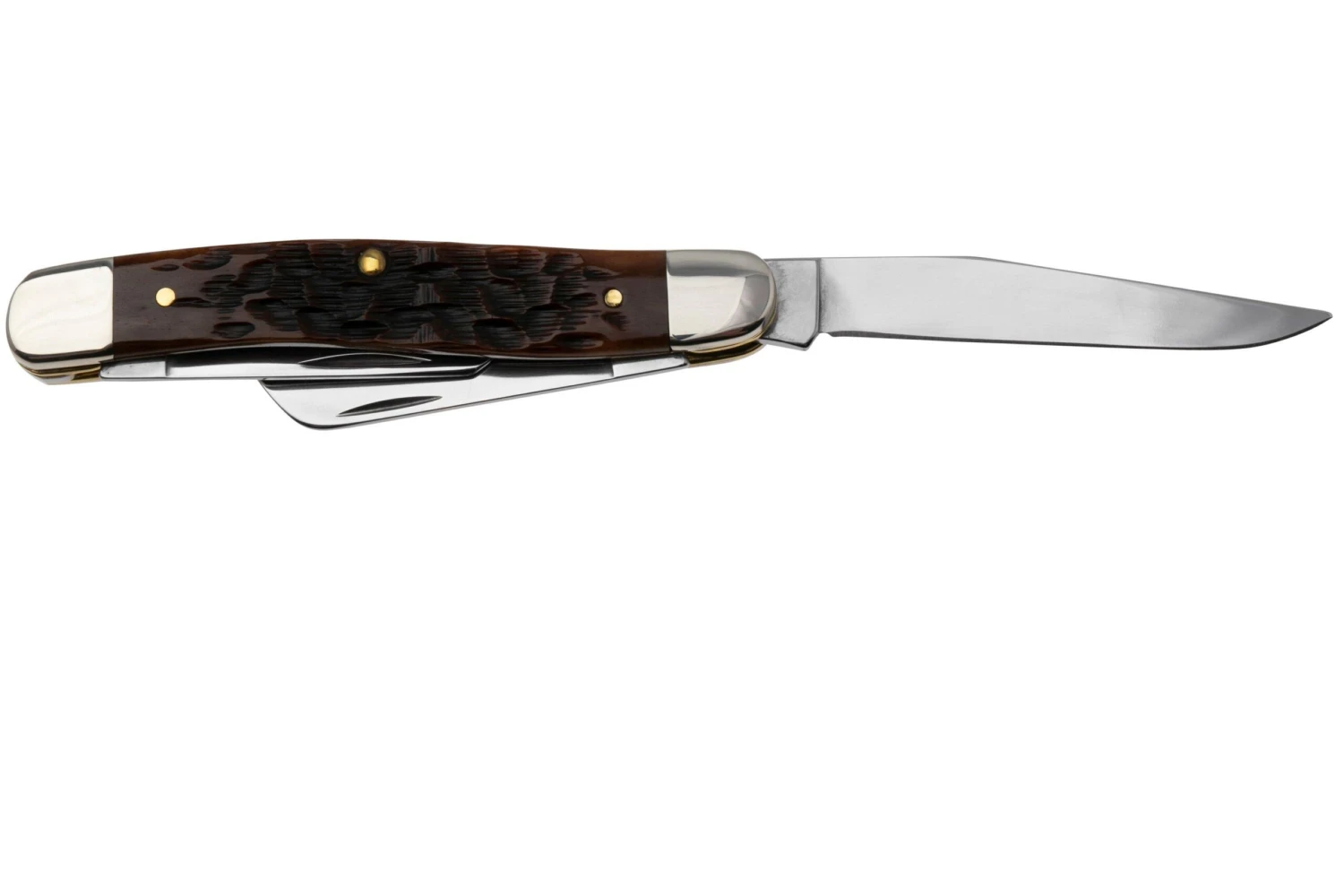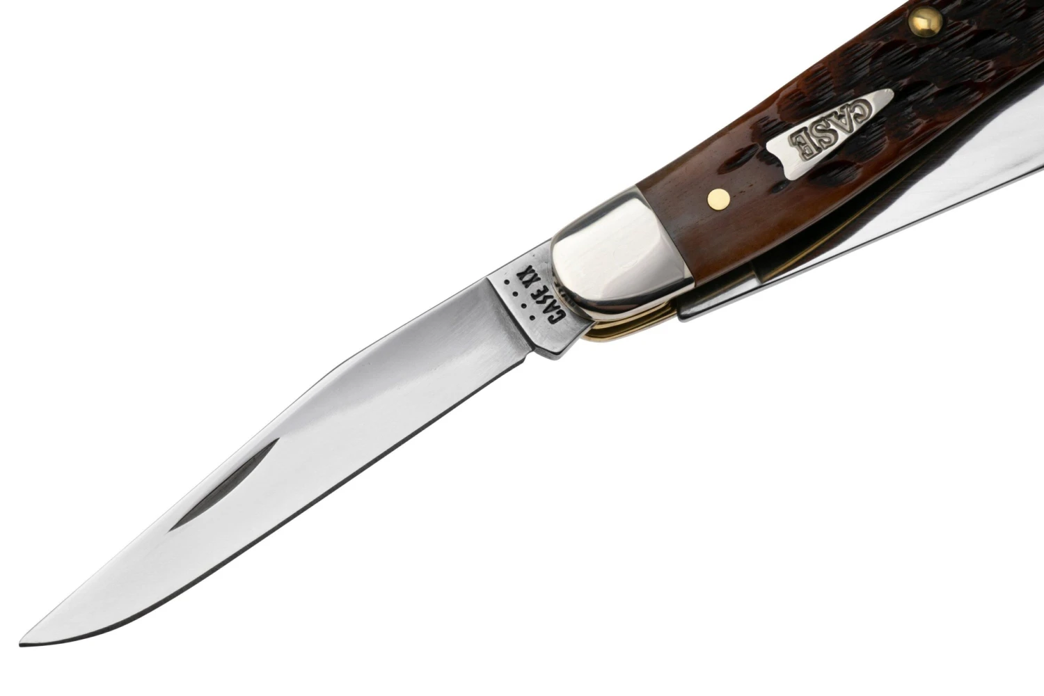 Das Case Medium Stockman ist ein echter Klassiker in der Welt der Taschenmesser. Die Form ist fast so alt wie die ganze Kategorie der Traditionals selbst. Das Case Stockman ist eine sehr reine Inkarnation des klassischen Modells. Es gibt drei Klingen: eine Clippoint-Klinge als main blade, eine Sheepfoot-Klinge von 5,0 cm und natürlich die für ein Stockman unverzichtbare Spey-Klinge. Dabei handelt es sich um eine Spearpoint-Klinge mit einer Art stumpfen Spitze. Diese Klingenform wurde ursprünglich für das Häuten von Wild genutzt.