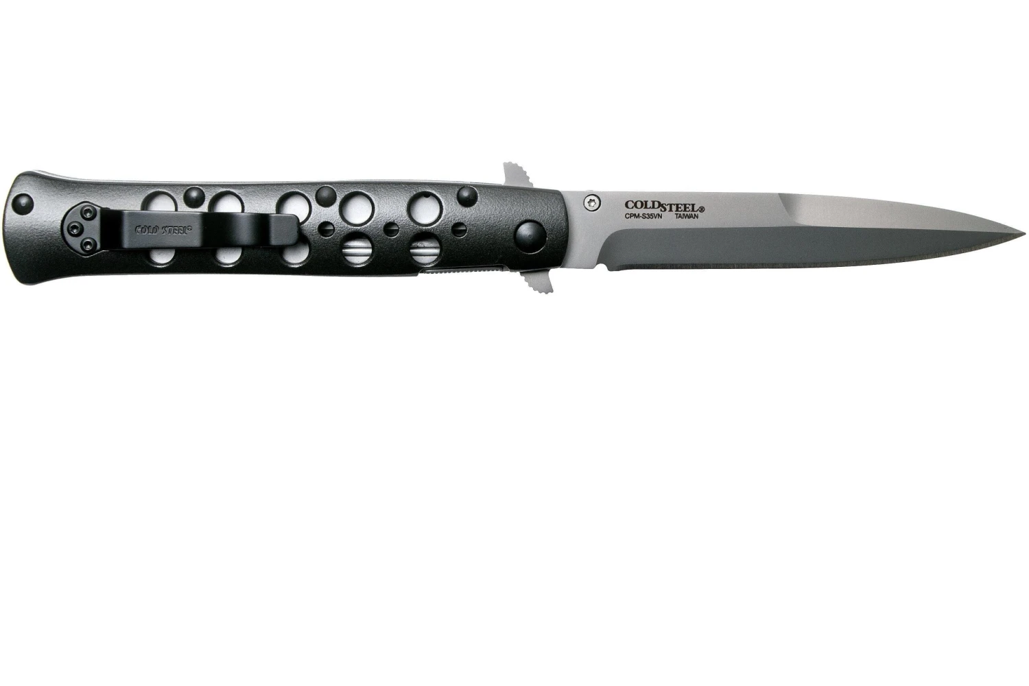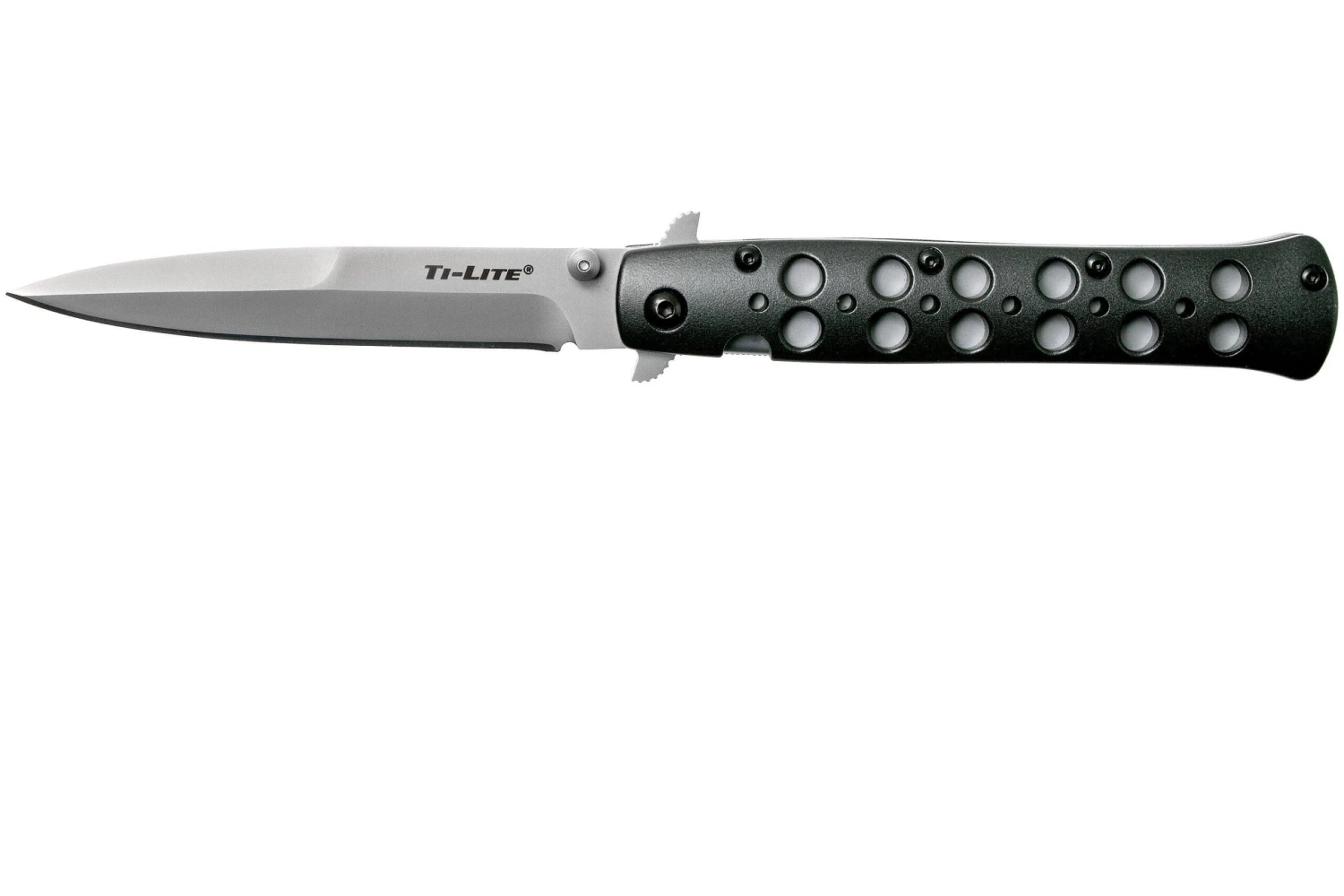 Das Cold Steel Ti-Lite ist ein schlankes Taschenmesser mit mehreren Öffnungsmöglichkeiten. So kannst Du das Messer mit dem Flipper, Daumenpin oder dem Frontflipper öffnen. Die Klinge ist aus CPM S35VN-Stahl, einer amerikanische rostfreie Stahlsorte. Als Form wurde ein spitzer und schlanker Spear-Point gewählt. Der Griff ist aus Aluminium. Um Gewicht zu sparen, wurden hier Aussparungen ausgefräst.