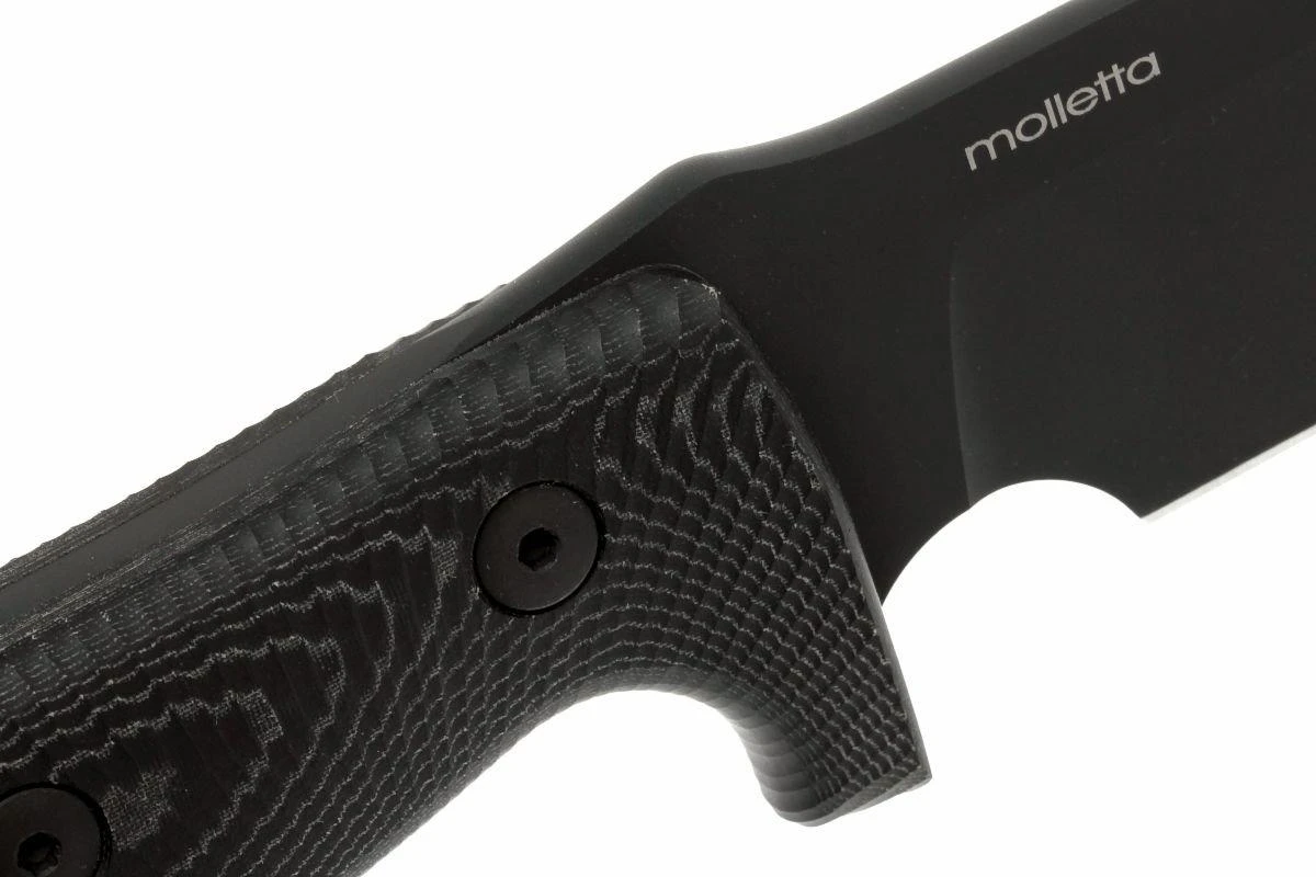 Das M7 von LionSteel entstand auf der Basis einer Limited Edition Version des Carthago, das in Zusammenarbeit mit Messermacher Michel Pensato (Beiname Moletta) entwickelt wurde. Mit einigen Anpassungen entstand ein feststehendes Allroundmesser, das über eine Full Tang Klinge und einen einteiligen Micartagriff verfügt. Der große Griff bietet genügend Platz für die ganze Hand, zudem verfügt das Messer am hinteren Klingenende über eine Aussparung für den Zeigefinger, mit deren Hilfe das M7 sehr gezielt und genau geführt werden kann. Das Fräsmuster des Griffs verstärkt nicht nur den Grip, sondern man erkennt auch sofort das besondere Design, das typisch ist für LionSteel Messer. Einzigartig ist auch der einteilige Micartagriff. Im Gegensatz zu anderen Messern, bei denen der Griff aus zwei zusammengeschraubten Griffschalen besteht, wurde hier der Griff aus einem Teil gefräst, und die Full Tang Klinge „steckt“ praktisch im Griff. Es verleiht dem schwer ausgeführten Messer noch zusätzliche Stabilität, da diese Konstruktion bombenfest sitzt. Die Klinge aus Sleipner Stahl hat auf dem Rücken eine Klingenstärke von 5,5 mm. In Kombination mit der Härte dieses Stahls wird das M7 in jeder erdenklichen Situation auch unter schwersten Bedingungen seinen Mann stehen.