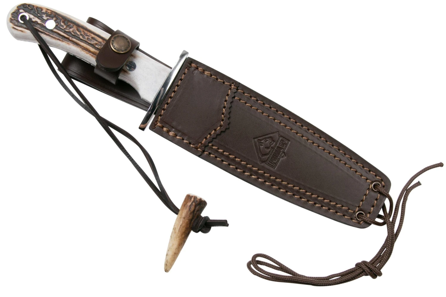 Das PUMA IP El Anta ist ein klassisches Jagdmesser. Dieses Jagdmesser wird in Spanien in Handarbeit hergestellt. Der schöne Hirschhorngriff hat Fingerrillen, so dass das Messer gut in der Hand liegt. Die Griffschalen werden durch zwei traditionelle Nieten zusammengehalten. Das Messer und der Griff sind durch einen großen Bolster aus rostfreiem Stahl schön voneinander getrennt. Dieser fungiert auch als fingerguard (Fingerschutz). Die robuste, bowie-förmige Klinge ist aus rostfreiem Stahl gefertigt.