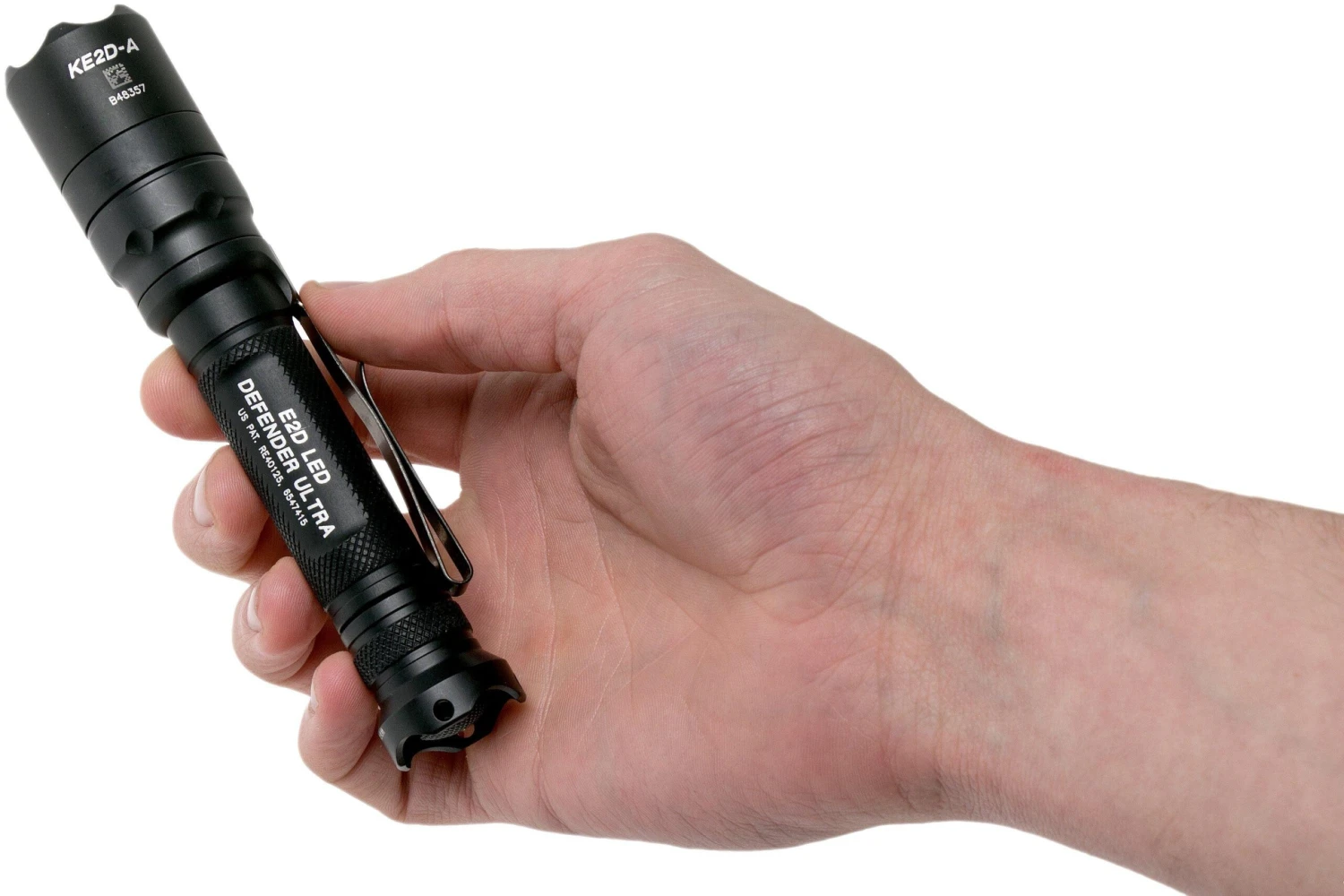 Die SureFire Defender ist eine einfache, taktische Taschenlampe, die ein 1000 Lumen starkes, weißes Licht erzeugt. Der Strahl, der von einer Total Internal Reflection (TIR)-Linse fokussiert wird, hat eine Reichweite von 200 Metern. Zusätzlich zur 1000-Lumen-Einstellung bietet die Defender auch eine niedrige Einstellung von nur 5 Lumen. Optimal für Situationen, in denen Du nicht so viel Licht benötigst. Mit vollen Batterien kann die Lampe ganze 63 Stunden in der niedrigen Einstellung brennen.